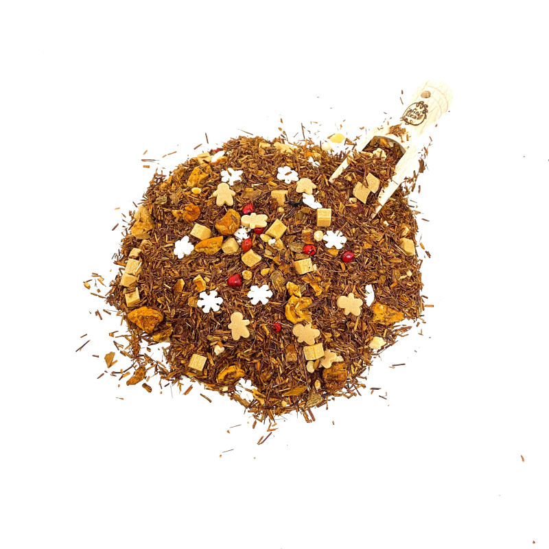 Rooibos, morceaux de pomme, morceaux de caramel à la crème, morceaux de croquant de sucre & noisettes, morceaux de cannelle, sucre bonhomme en pain d’épices, cristaux de sucre, grains de poivre rose, arôme naturel.