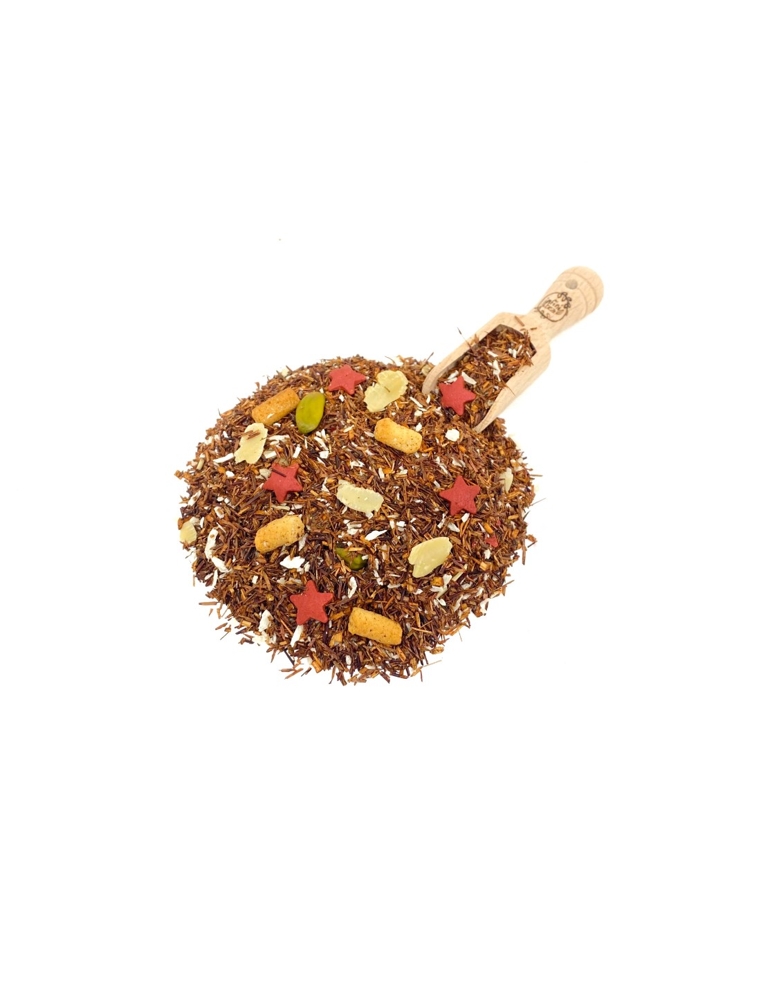 Rooibos, coco râpée, étoiles rouges de sucre, pistaches, amandes, arôme, gouttes de massepain.