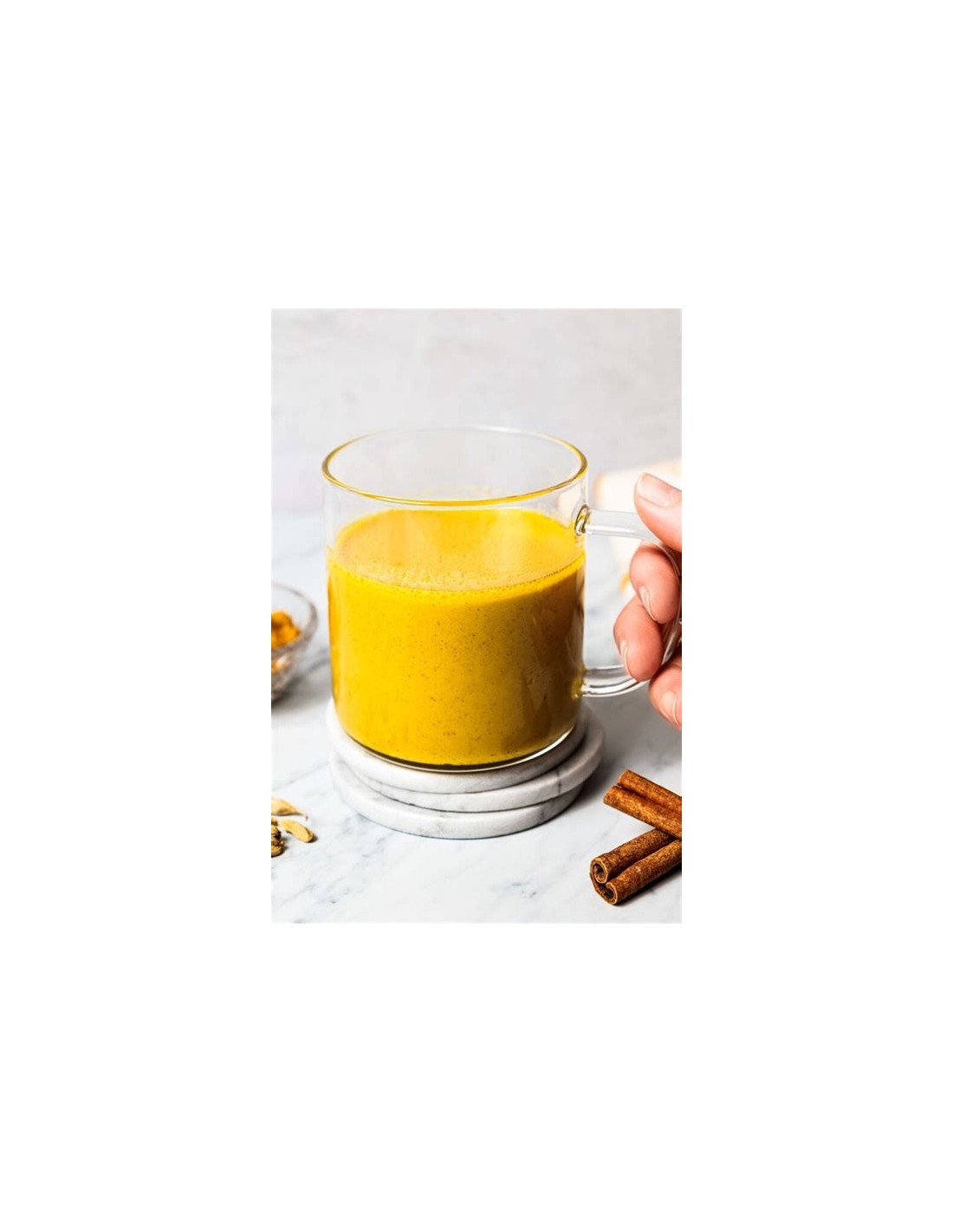 Faites chauffer une tasse de boisson végétale ou de lait, sans faire bouillir. Ajoutez ensuite une cuillère à café de préparation pour lait d’or, mélangez soigneusement jusqu’à dissolution complète et sucrez selon vos envies. Les notes délicatement épicées du curcuma, du gingembre, de la cannelle, de la muscade, de la cardamome et du poivre se diffusent instantanément pour une boisson onctueuse et parfumée.