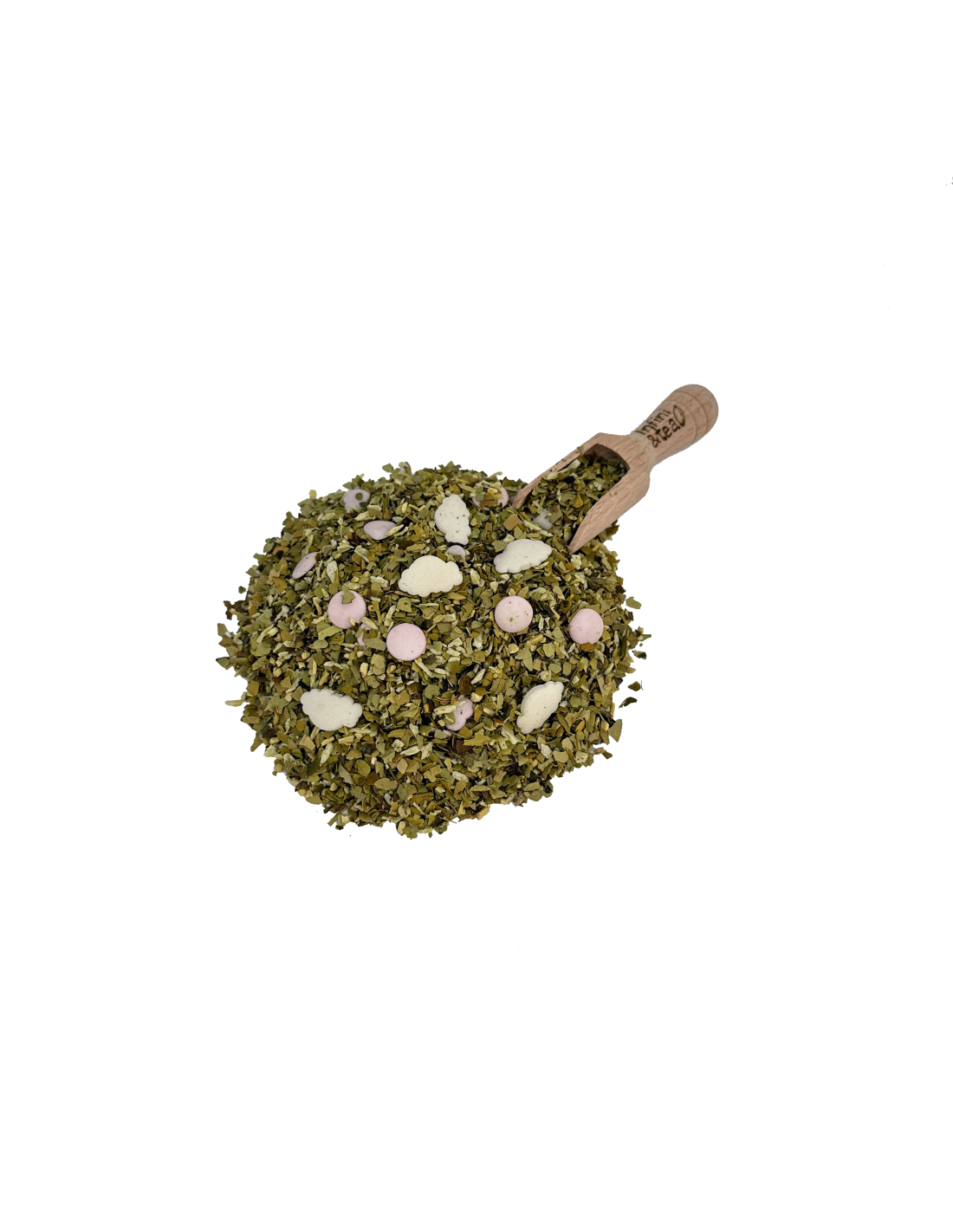 Maté brésilien, coco râpée (25%), mélange de cœurs et nuages de sucre, feuilles de mûre douce, arôme naturel de tonka, extrait naturel de vanille bourbon.